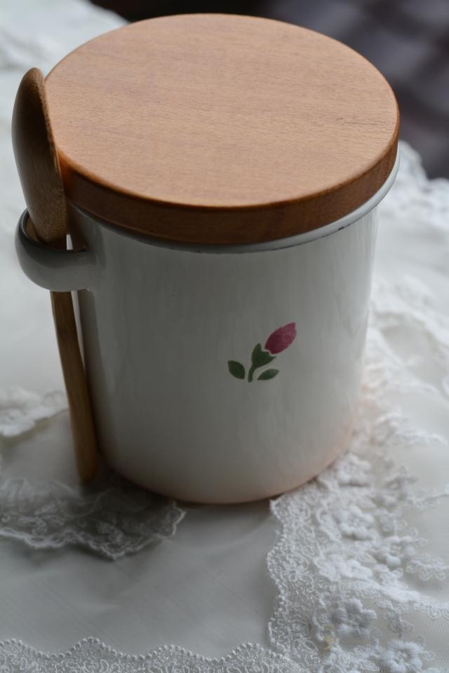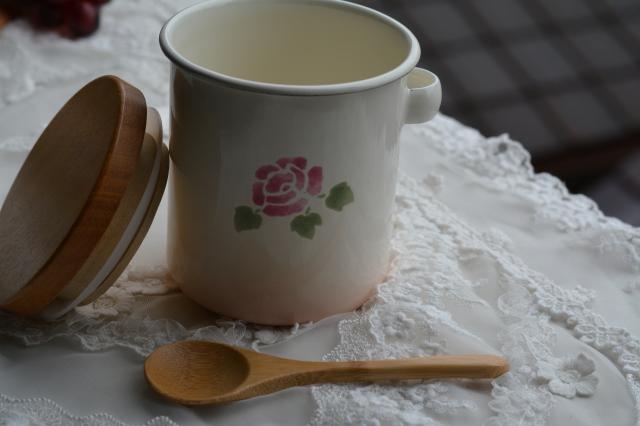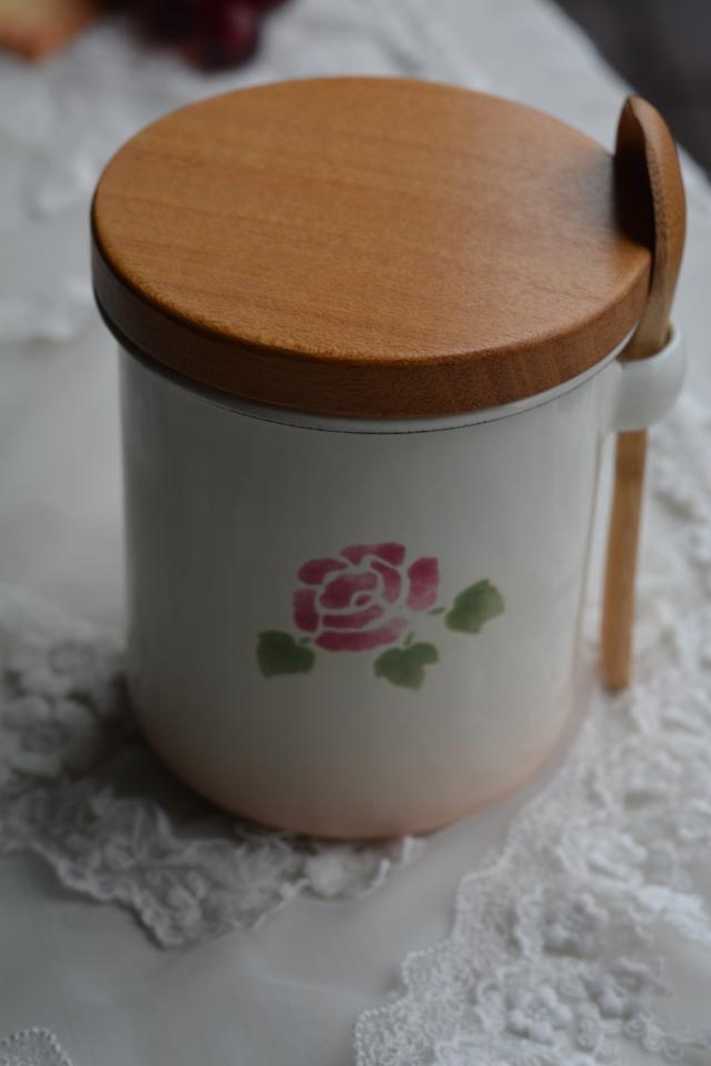 マニーローズのホーロー調味料入れです 木のフタとスプーンが可愛いキャニスターです。 フタの裏にはシリコンが付いていますので湿気に強いです。